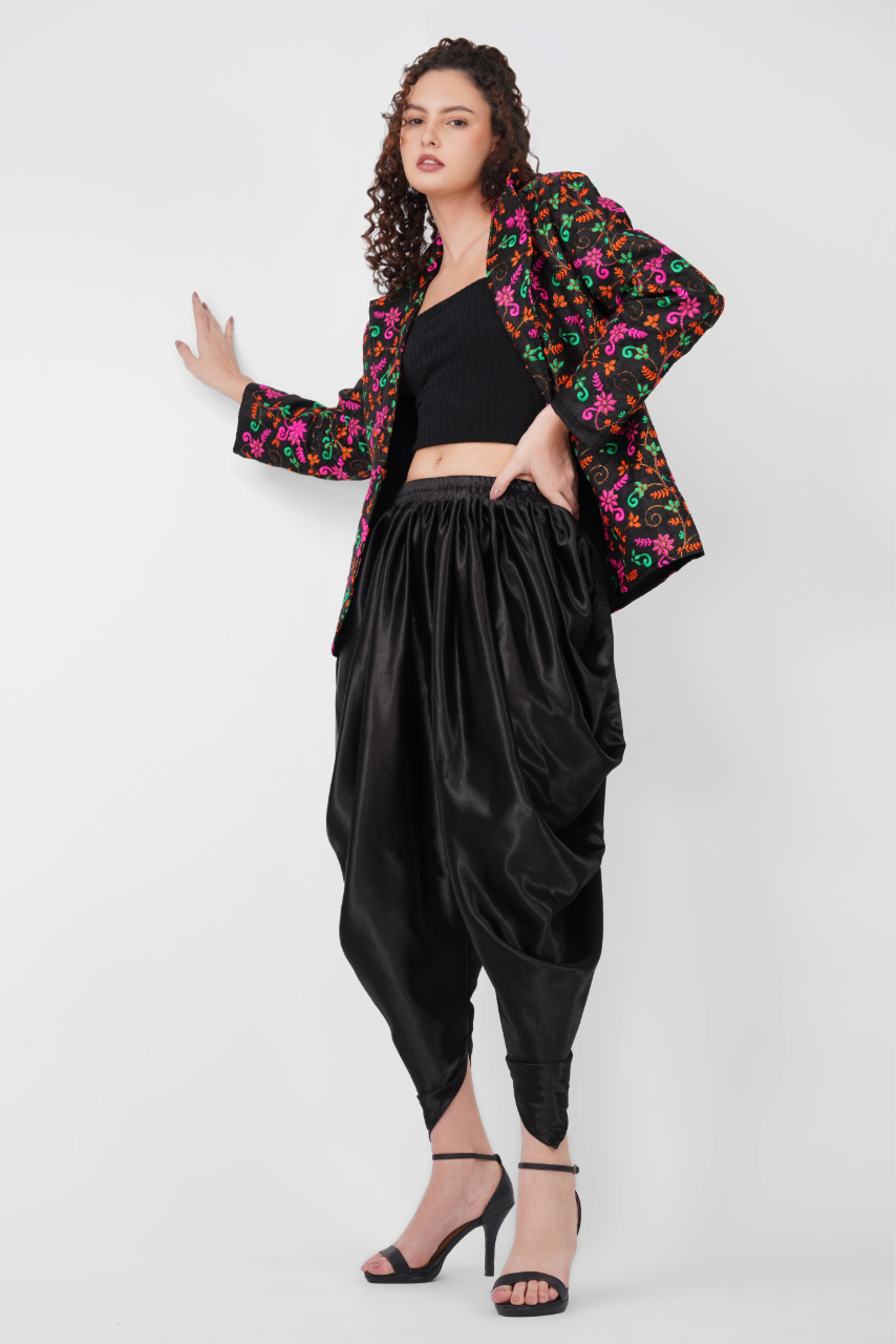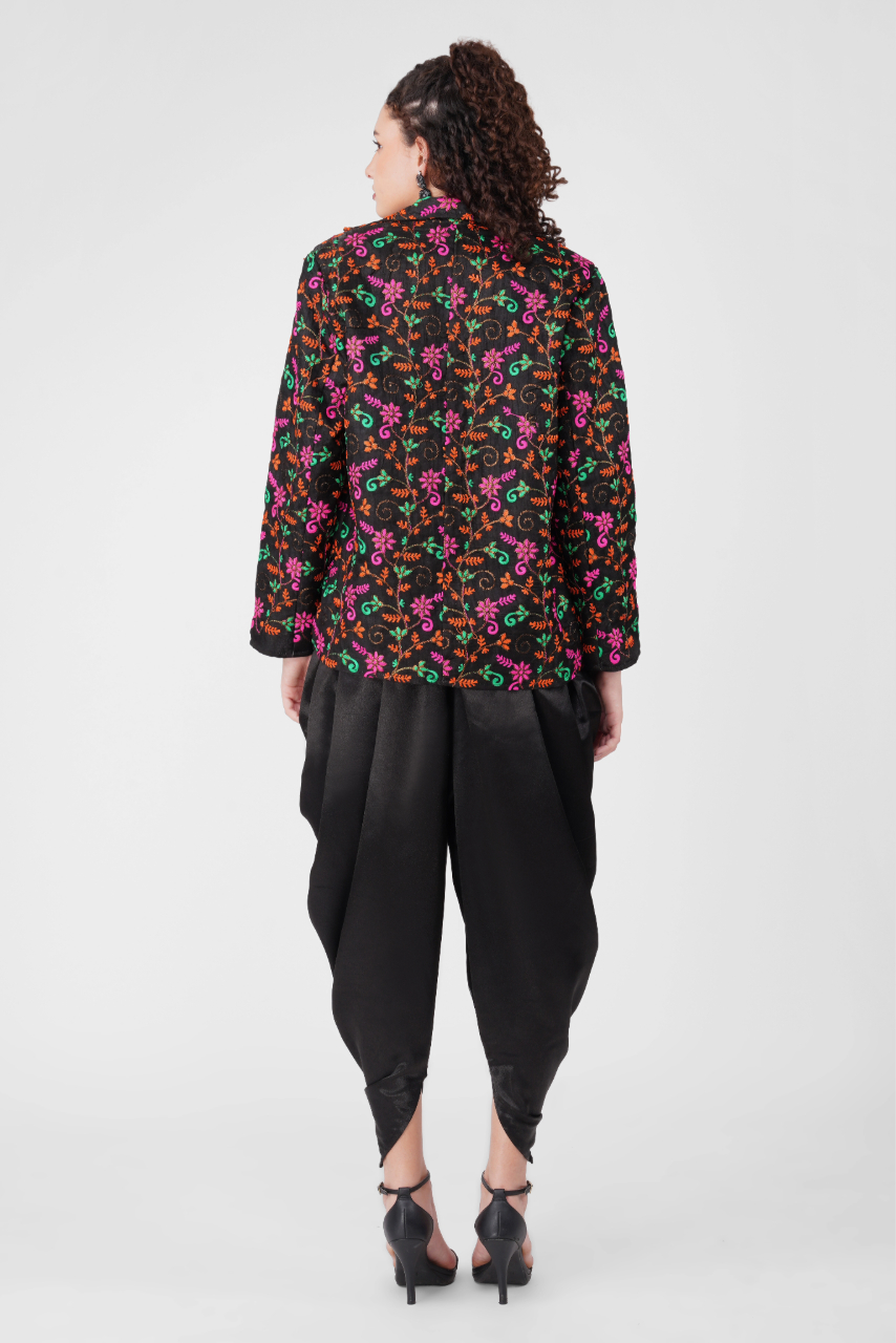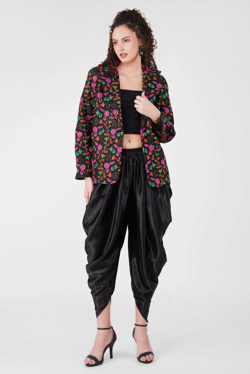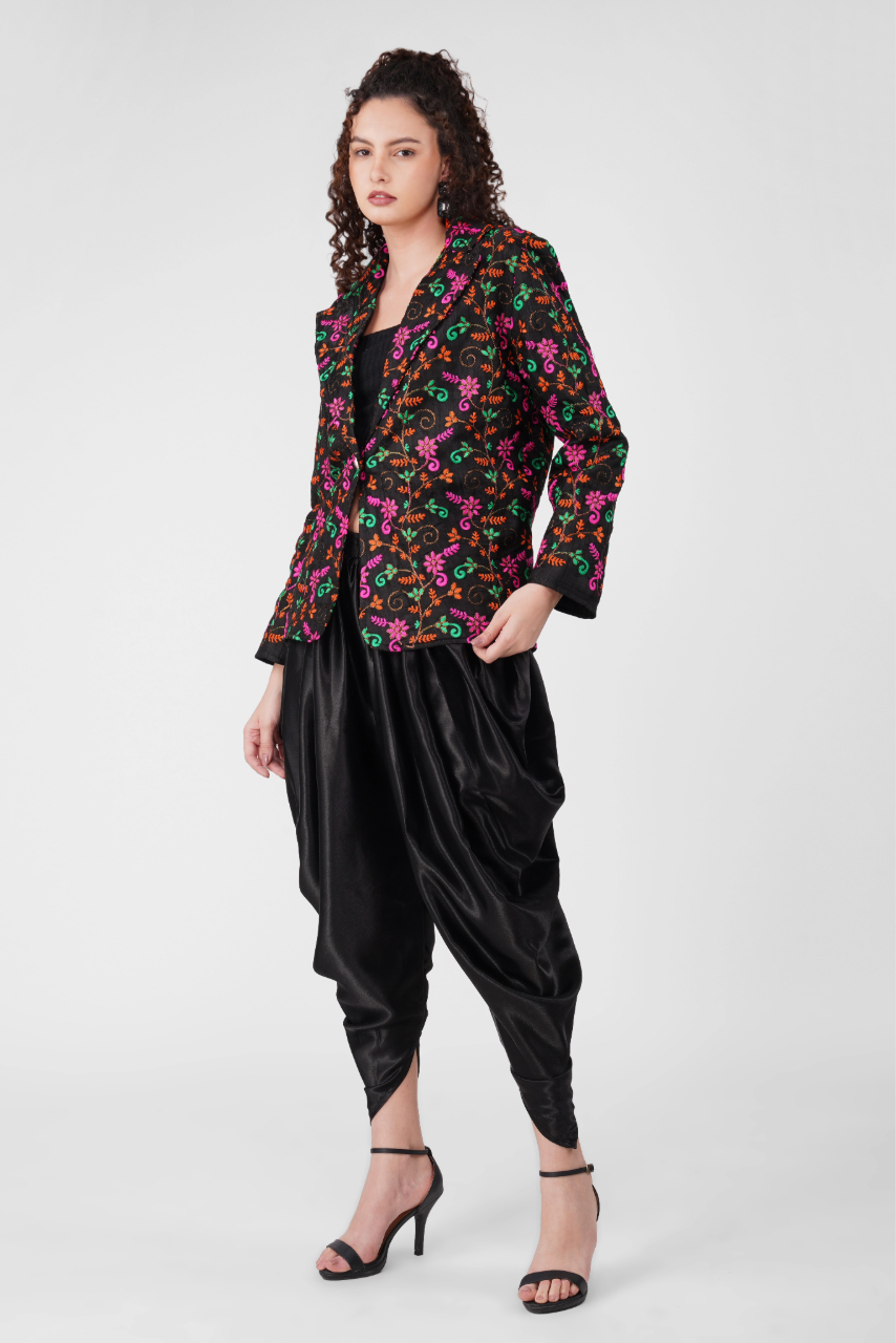 Celebrate colour, creativity, and couture with The Bloom Royale Dhotti Co-ord Sets — a stunning fusion of art and fashion. The statement multi-coloured floral coat features vibrant blooms woven across rich fabric, designed to captivate with every glance. Its longline silhouette adds grace and movement, balanced by elegant black dhoti pants that bring a modern, draped twist to traditional styling. Make a stunning statement with this exquisite Indo-Western Ensemble, perfectly blending traditional artistry with contemporary flair. This two-piece set features a vibrant embroidered jacket paired with chic, sculpted dhoti pants, creating a look that is both striking and sophisticated. The thread work bursts with color, showcasing vivid shades of neon pink, bright orange, lime green, and teal. Perfect for festive occasions, couture events, or evenings that call for bold sophistication.