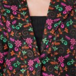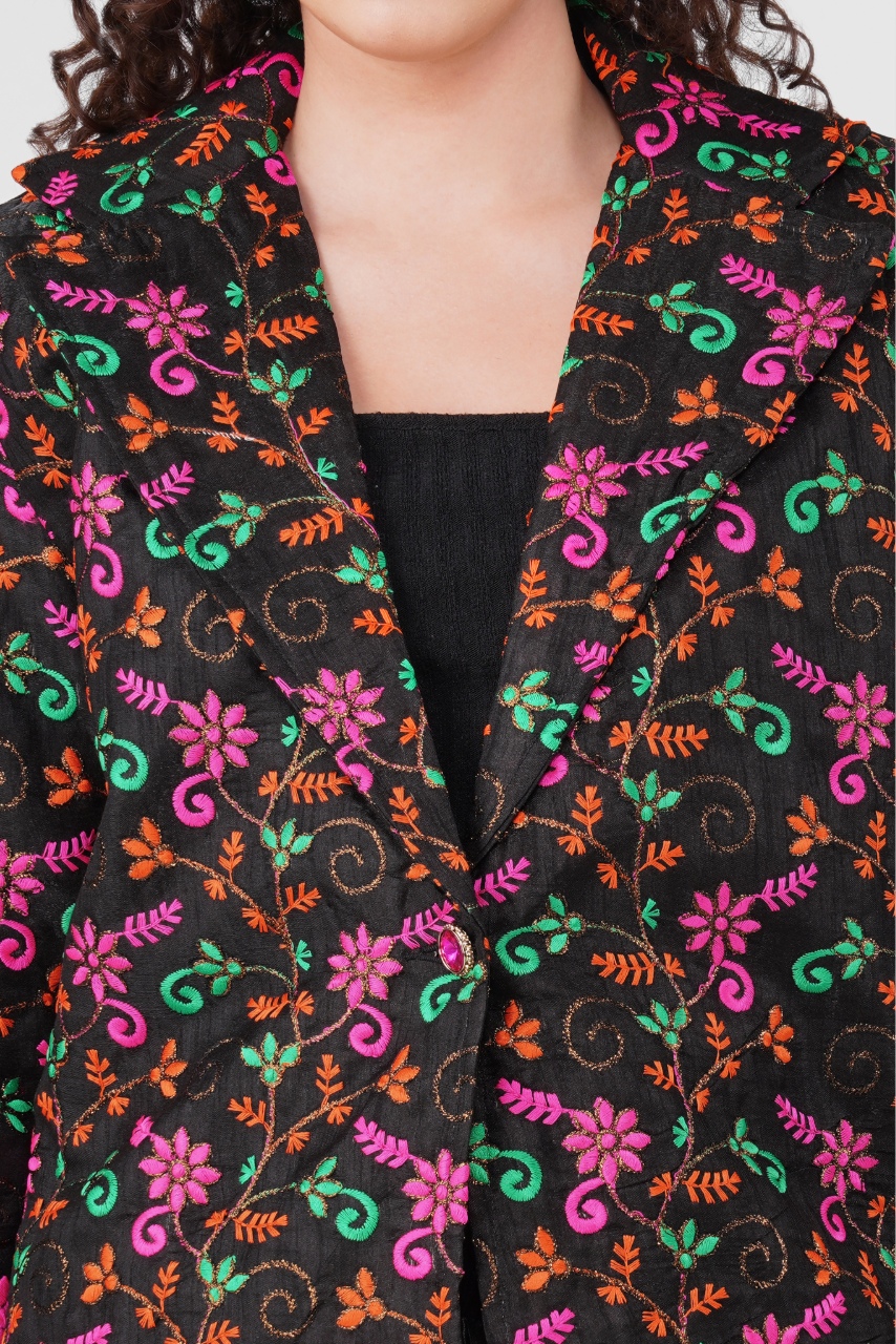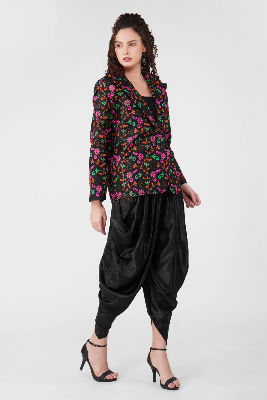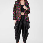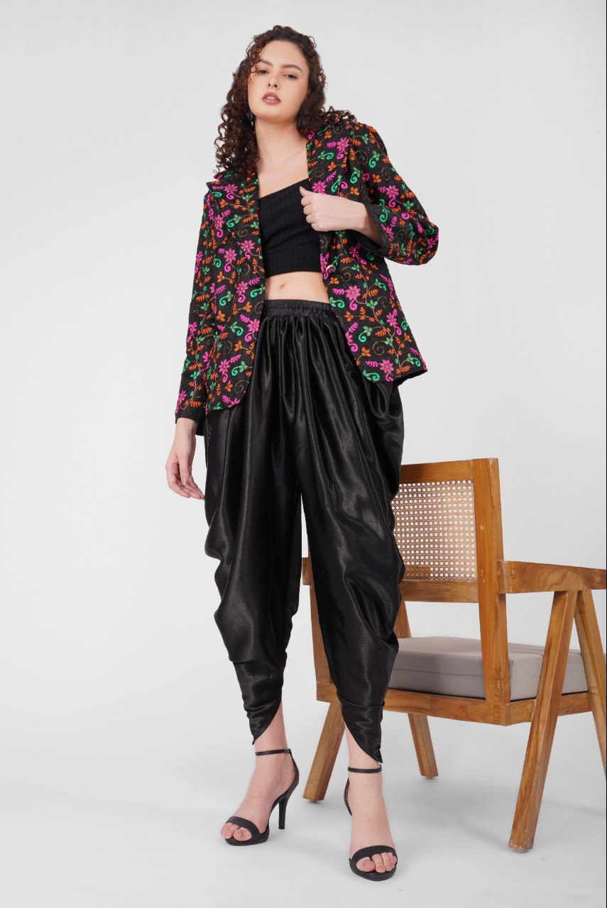 Celebrate colour, creativity, and couture with The Bloom Royale Dhotti Co-ord Sets — a stunning fusion of art and fashion. The statement multi-coloured floral coat features vibrant blooms woven across rich fabric, designed to captivate with every glance. Its longline silhouette adds grace and movement, balanced by elegant black dhoti pants that bring a modern, draped twist to traditional styling. Make a stunning statement with this exquisite Indo-Western Ensemble, perfectly blending traditional artistry with contemporary flair. This two-piece set features a vibrant embroidered jacket paired with chic, sculpted dhoti pants, creating a look that is both striking and sophisticated. The thread work bursts with color, showcasing vivid shades of neon pink, bright orange, lime green, and teal. Perfect for festive occasions, couture events, or evenings that call for bold sophistication.